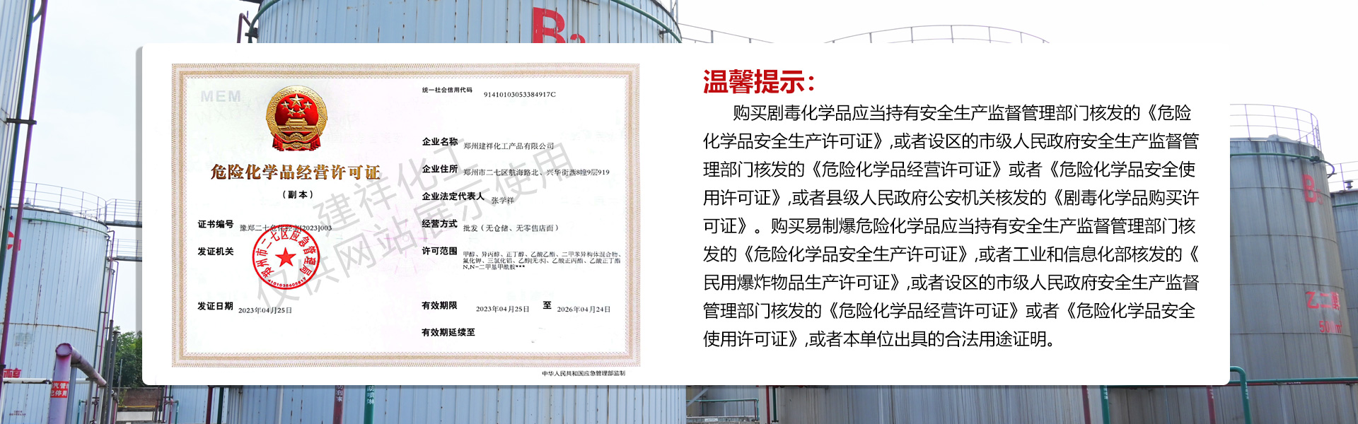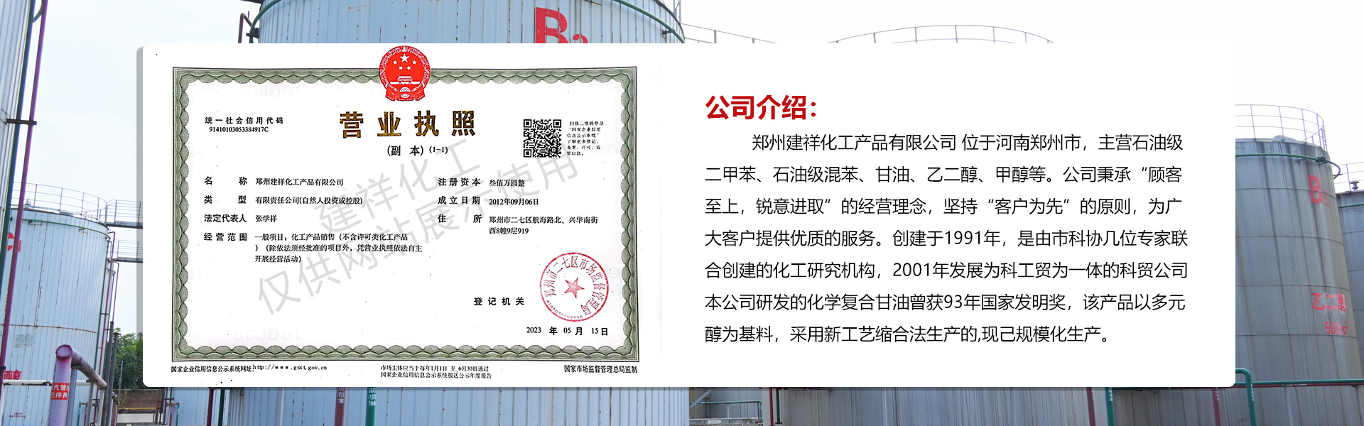 鄭州建祥化工產品有限公司 位于河南鄭州市,主營石油級二甲苯、石油級混苯、甘油、乙二醇、甲醇等。公司秉承“顧客至上,銳意進取”的經營理念,堅持“客戶第一”的原則為廣大客戶提供優質的服務。創建于1991年,是由市科協幾位專家聯合創建的化工研究機構,2001年發展為科工貿為一體的科貿公司,本公司研發的化學復合甘油曾獲93年國家發明獎,該產品以多元醇為基料,采用新工藝縮合法生產的,現己規模化生產。...